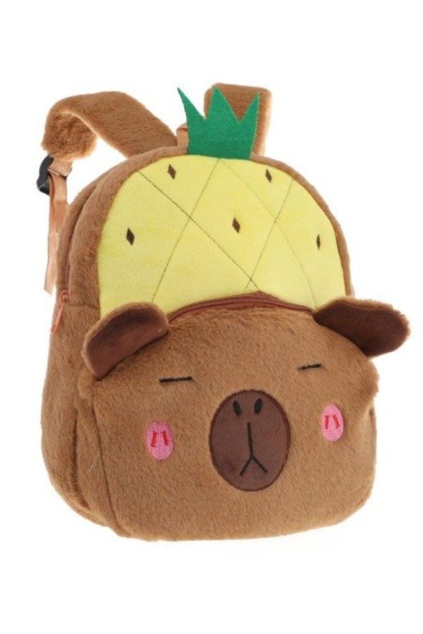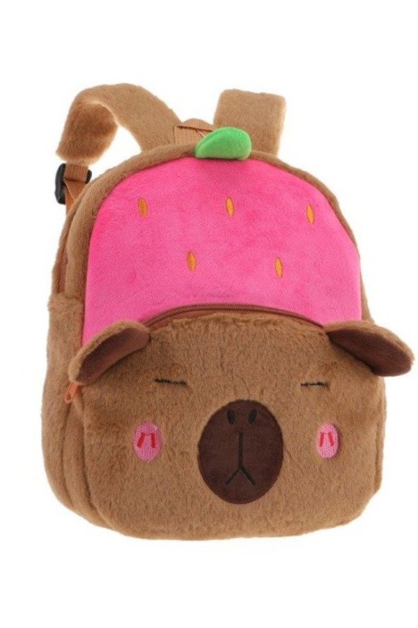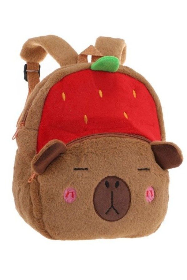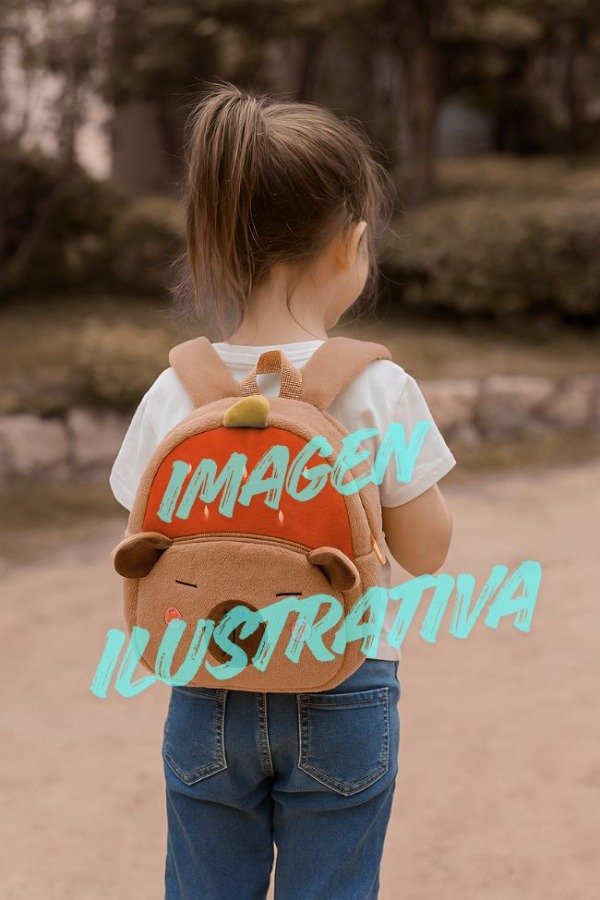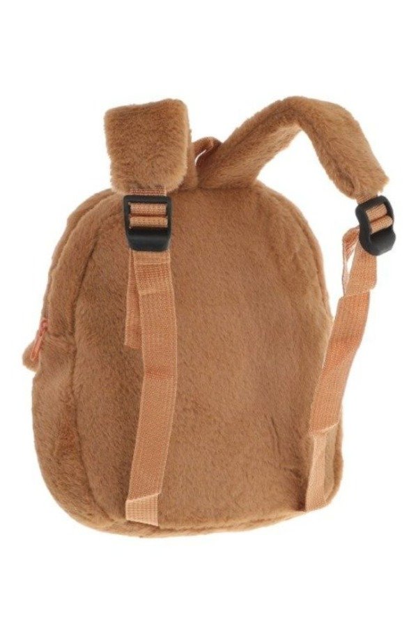 Material: 100% Peluche. -Medidas: 27cm alto x 24cm ancho x 7cm profundidad. -Contiene: Bolsillo principal, bolsillo frontal, asa de transporte superior y tiras regulables.