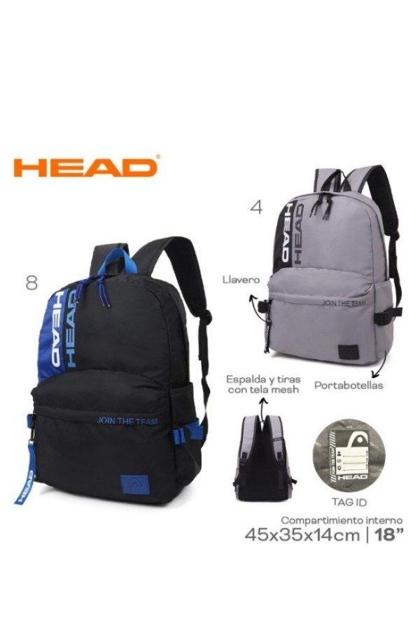 Mochila con espalda y tiras con tela mesh, bolsillo para botellas y llavero. -Medidas: 45 x 35 x 14 cm. Capacidad: 22 L.